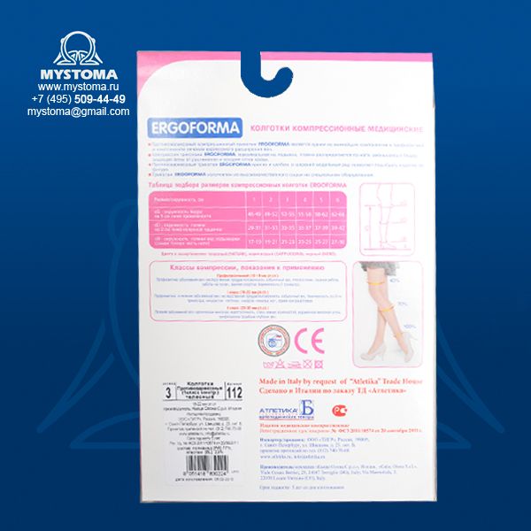 Колготки рекомендуется использовать в течение всего дня, одевая их утром лежа, предварительно приподняв на некоторое время ноги для улучшения венозного оттока. Снимают изделие перед сном. Врачи рекомендуют сочетать их ношение с двигательной активностью. Стирают только теплой водой (не более 30°C), только руками. Для стирки используют только высококачественные моющие средства. Отжимать и сушить данное изделие с помощью электроприборов категорически не рекомендуется. Сушка проводится в горизонтальном положении. Таблица ассортимента профилактических колготок Эргоформа: Обратите внимание: Измерения нужно проводить утром до появления возможности образования отеков.