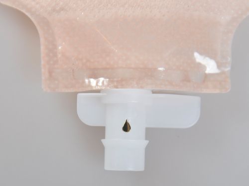 - Сливной клапан имеет маркировку в виде "золотой капли" для удобства дренирования мешка. "Золотая капля" располагается со стороны тела, когда мешок закрыт, и не видна. При открытии мешка клапан поворачивается так, что "Золотую каплю" видно - это означает, что мешок открыт.