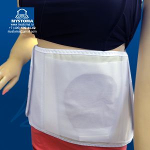 Специальный бандаж с отверстием под стому или дренаж для использования в период реабилитации после операции по наложению стомы, поддержки передней брюшной стенки у пациентов со стомой.