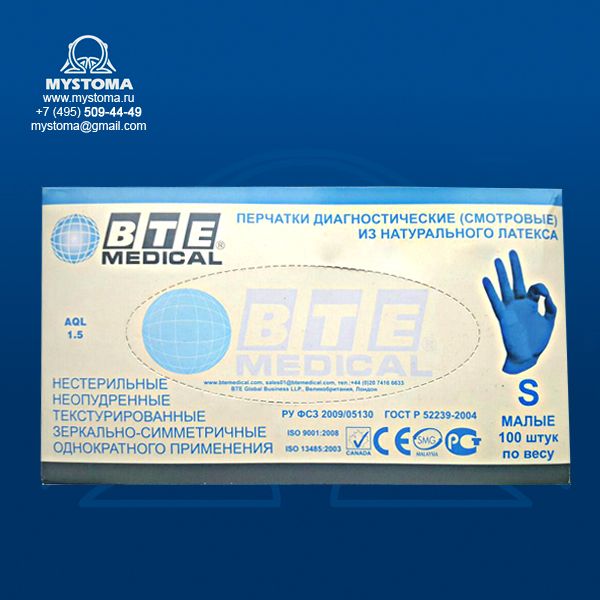 Смотровые диагностические перчатки «BTE Medical» зеркально-симметричной формы, текстурированные, неопудренные, нестерильные, из натурального латекса (хлорированные). Размер: S. Функциональные характеристики: - Защита от нежелательных и опасных веществ. - Легкое одевание и предотвращение от скатывания. - Хорошая эластичность обеспечивает отличное удобство и естественную чувствительность. - Манжета с валиком облегчает одевание перчатки. - Неопудренность исключает раздражение от пудры и развитие дерматита у пользователей перчаток. -Текстурированная поверхность ладоней и пальцев обеспечивает улучшенный захват. - Низкий уровень выделяемых белков и химического остатка, как следствие более низкая склонность к аллергическим реакциям. - Используются для диагностических процедур, в стоматологии. Применяемые стандарты качества: - Соответствует стандартам ASTM D3578 (05) и EN455 (часть 1, часть 2, и часть 3). - Произведены в соответствии с QSR (GMP) и Системой Менеджмента Качества ISO9001:2000. Ассортимент перчаток BTE смотровые латексные: bi0014 Перчатки BTE смотровые латексные нестер.неопудренные текстурированные, 50 пар, размер S bi0015 Перчатки BTE смотровые латексные нестер.неопудренные текстурированные, 50 пар, размер L Как правильно выбрать размер перчаток? Для смотровых перчаток используется международная классификация SML (small-medium-large). Так размер XS соответствует 5-6 размеру,