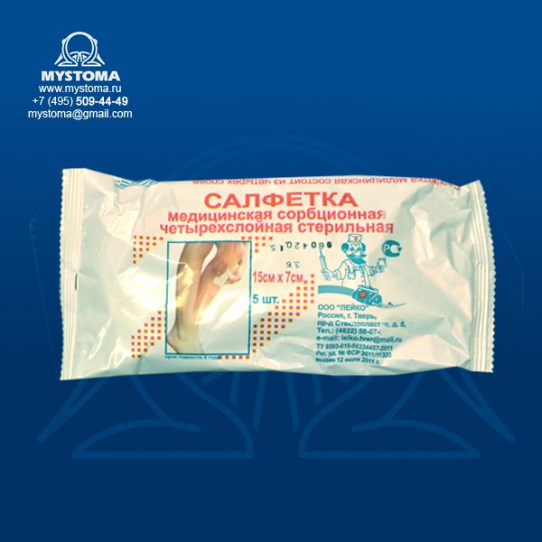 Салфетка сорбционная четырехслойная стерильная. Предназначены для ухода за свежими и хроническими ранами с обильным отделяемым. Благодаря многослойности салфетки впитывают и удерживают влагу внутри таким образом, что через 10 минут после использования внешняя поверхность становится сухой. Исключают болевые ощущения при перевязке. Салфетка проницаема для воздуха, мягкая, драпируется. Частота смены салфетки зависит от раны. Компания Лейко (Россия) производит салфетки перевязочные впитывающие, состоящие из четырех слоев. Первый слой - мягкая оболочка из непроклеивающегося нетканого материала. Салфетки упакованы в защитную упаковку. Одна упаковка содержит 5 салфеток размером 10*7 см. Также салфетки другого размера: ЛБ0129 Салфетка мед-кая четырехслойная сорб. стер. 15см х7см №5